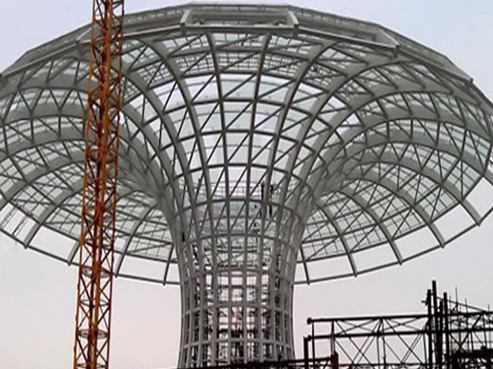 二、球形网架结构因其结构新颖,受力合理,自重轻、用钢量低等优点。如大型体育场馆球形安顺螺栓球网架、公共场馆球形网架、电厂安顺螺栓球网架、水泥工业球形网架、仓储物流球形网架、安顺干煤棚工业球形网架、安顺收费站安顺加油站球形网架、展览中心、影剧院、商场、航站楼、候车厅、工厂安顺车间、仓库、电视塔等球形螺栓球节点网架。国内球形网架结构主要分为:安顺焊接球节点网架及螺栓球节点网架两种。螺栓球节点网架其构件工厂内加工量较大,现场安装便捷,适用于现场工期紧,安顺施工条件、用电量受制约,网架形状复杂、安顺杆件定位困难的异形结构。螺栓球节点球形网架系统基本由安顺杆件、螺栓球、支撑支座等组成。按照节点形式可分为交叉安顺桁架体系、四角锥体系、三角锥体系等。支撑方式多为固定支座支撑。对于大面积、大跨度及有特殊受力或伸缩要求的网架结构可采用橡胶支座、滑移支座、球铰支座等支撑形式,以满足结构自身的受力稳定、均衡,便于内力释放等设计要求。